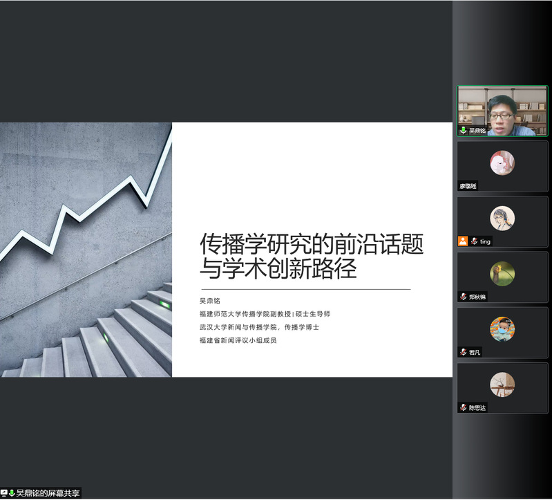 4月13日下午, 成人在线 邀请福建师范大学传播学院吴鼎铭副教授开展《传播学研究的前沿话题与学术创新路径》的线上专题学术讲座,讲座由院长助理陈思达副教授主持,全院30余名教师一同聆听讲座。