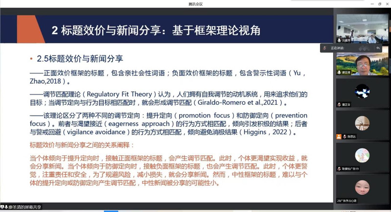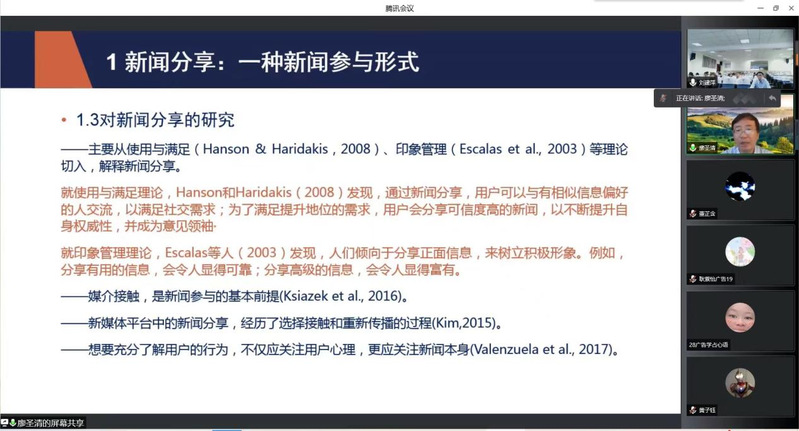 5月18日下午,复旦大学新闻学院教授、博导,云南大学新闻学院(南亚东南亚国际传播学院)院长,国家2011两岸关系和平发展协同创新中心专家委员,中国新闻史学会符号传播学研究委员会副会长廖圣清教授应邀为 成人在线 师生做题为“标题效价对新媒体平台中新闻分享的影响”的线上讲座,讲座由院长助理陈思达副教授主持。