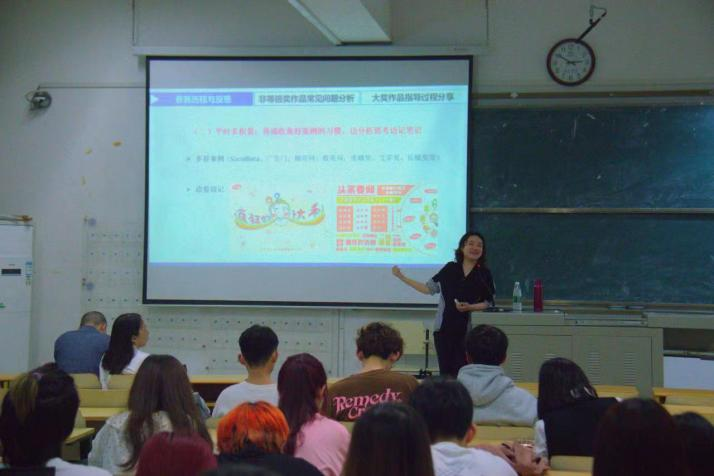 陈丽老师首先就从教以来的参赛历程与反思,向同学们提出三点建议:一是收起功利心,做一份拿得出手的作品,而不是一份获奖作品;二是平时多积累,养成收集好案例的习惯,边分析思考边记笔记;三是及时反思总结,比对研究公示的获奖作品,思考自身差距不足。陈丽老师强调,同学们应当学会发现自身不足并加以完善,锻炼自己分析作品的能力。