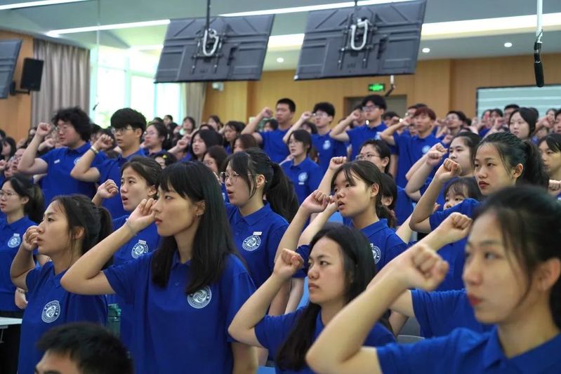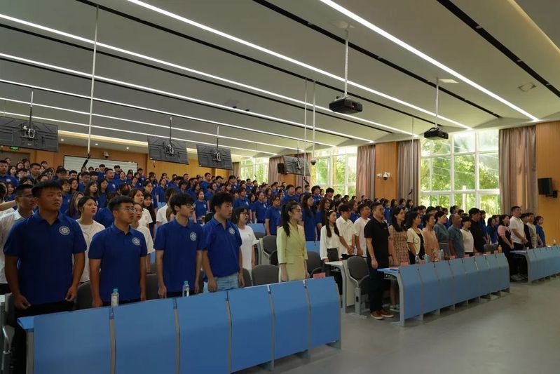 最后院领导为新生代表佩戴校徽,全体新生庄严宣誓:热爱祖国,忠于人民;尊师守纪,勤奋学习;团结互助,全面发展;踔厉奋发,笃行不怠;不负青春,不负时代。