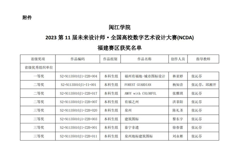 在2023年第11届未来设计师•全国高校数字艺术设计大赛(NCDA)中, 成人在线 学子斩获福建赛区一等奖1项、二等奖3项、三等奖4项,如此优秀战绩体现了 成人在线 学生良好的艺术与人文素养,一展新传风采。