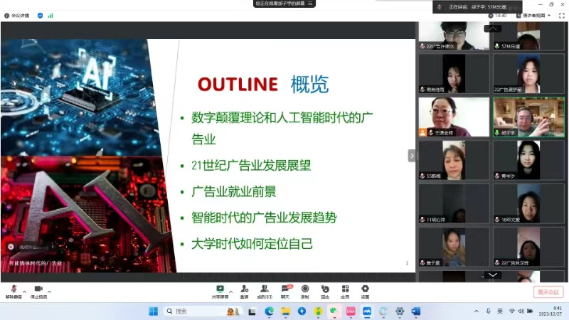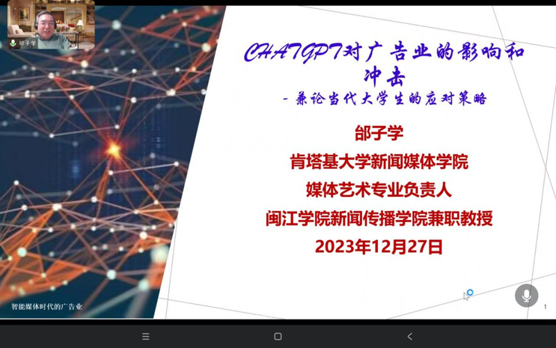 12月27日上午,闽都学者讲座教授、肯塔基大学邰子学教授,为2022级广告学专业学生开展“ChatGPT对广告业的影响和冲击——兼论当代大学生的应对策略”的线上主题讲座。