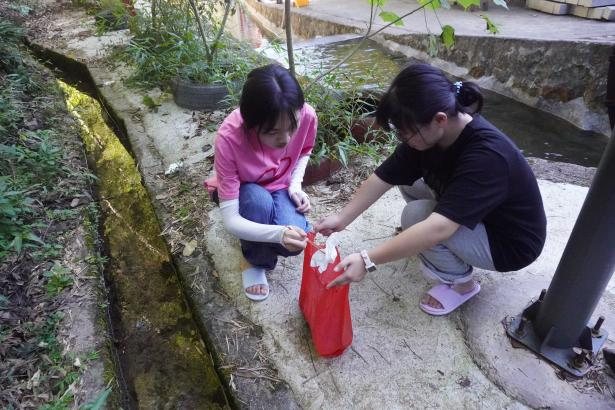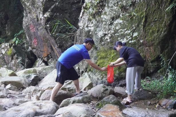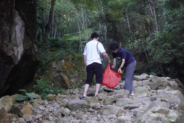 是日早上七点,实践队的同学们便抵达了塘西村著名景点萝卜坑。同学们手握钳子,俯身弓背,沿着潺潺的流水,深入岩石缝隙,仔细地捡拾那些与美丽风景格格不入的废弃物。塑料瓶、食品包装袋、烟蒂等,无一不在他们的收集范围内。