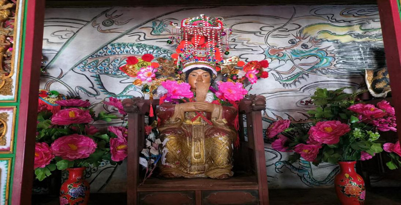 据村民们说庙里的主祀神为妈祖,但我认为其更像是法主仙妃(又称圣泉妈),因为仙游很多宫庙里只要有供奉法主仙妃的,神像旁边就会有一尊红脸配祀神,后文会有所介绍。由于莆仙的民间神祇过于芜杂,且二者在形象上十分相似,所以常常有人将二者混淆,这里姑且就认为其是妈祖。妈祖,原名林默,亦称“天妃”“天后”,俗称“海神娘娘”,出生于福建莆田湄洲岛,是传说中掌管海上航运的女神,头戴冕旈、身着霞帔,其神威显赫,雍容端庄。