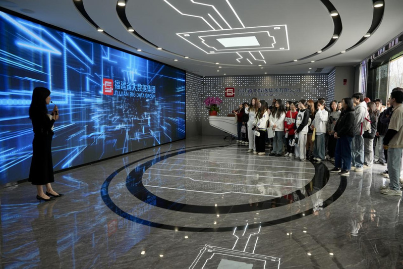 首先,一行人来到了福建省大数据集团有限公司旗下的数字政府展示中心,这里展示了公司在大数据领域的战略规划、技术创新及具体应用场景。企业代表为学生们讲解了大数据在不同领域中的价值体现,使得他们对这一技术有了更为直观的认识。