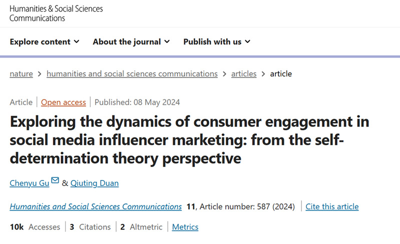 近日, 成人在线 广告学系副教授、福建数字传媒经济研究中心副研究员顾晨昱博士在Nature旗下期刊《人文社会科学通讯(Humanities & Social Sciences Communications)》发表文章“自我决定理论视角下社交媒体影响者营销中的消费者融入行为动态机制(Exploring the dynamics of consumer engagement in social media influencer marketing: from the self-determination theory perspective)”。成人在线 为论文第一单位,论文合作作者为上海大学教师段秋婷。该研究成果由成人在线 引进人才科研启动基金项目资助。