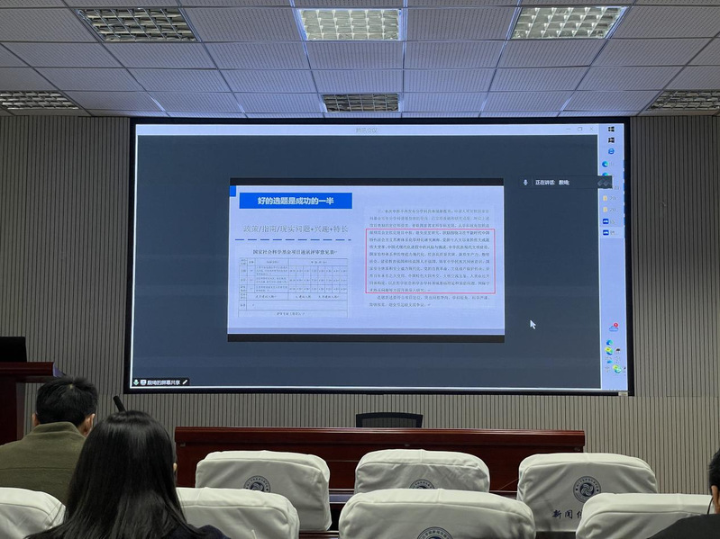 在情况介绍之后,殷琦教授指出“好的选题是成功的一半”,强调选题的重要性,建议申报者多关注大纲,紧跟国家热点议题。结合自身的写作经验,她详细写作的要领,总结了阐述问题导向型与平铺直述型两种选题方式,并指出选题应结合视角、背景、问题、对象和对策五个要素。殷教授还展示如何通过政策、指南、现实问题、兴趣和特长来确定研究方向,并通过国家社会科学基金项目的选题指南来启发思考。