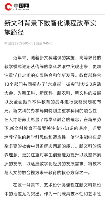 近日, 成人在线 数字媒体艺术专业郑成峰老师课题组联合撰写的文章《新文科背景下数智化课程改革实施路径》在新华网及中国网公开发布,文章上线后引发广泛关注,一周内阅读量迅速接近十万。