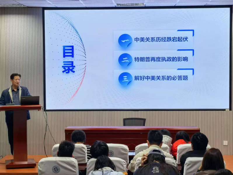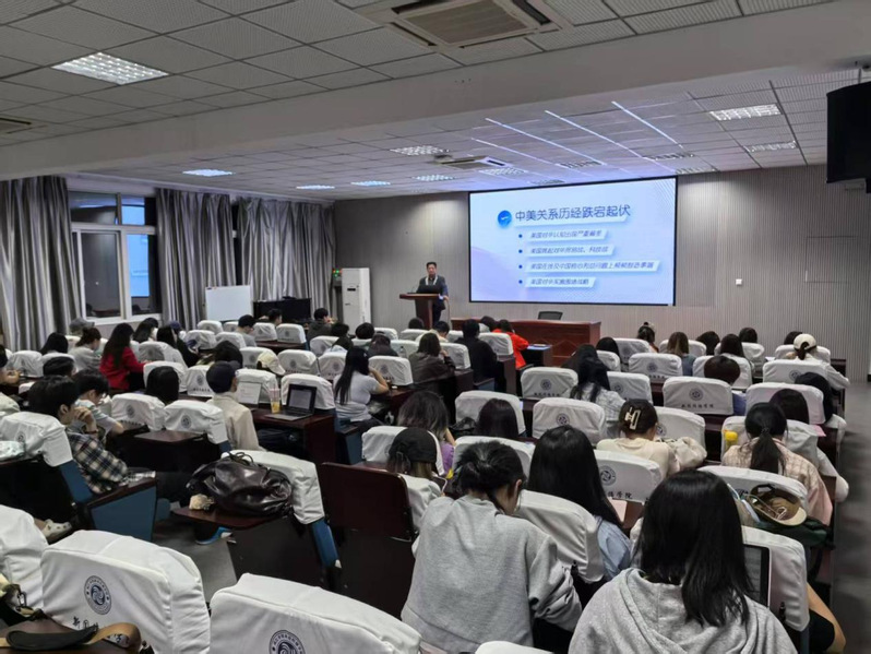 课堂上,张仪结合最新时事热点,引导同学们思考美国对华遏制政策的实质及其影响。作为新时代大学生,必须深刻认识到中美两国关系的复杂性与长期性,中美分别是最大的发展中国家和最大的发达国家,能否处理好彼此关系攸关世界前途命运。张仪梳理了近年来中美关系波折的根源,指出美国错误的对华战略认知是导致双边关系跌至历史低点的主要原因,并解读特朗普再度执政对国际政治经济秩序带来的冲击。他强调,坚持相互尊重、和平共处、合作共赢原则,才是构建中美新型大国关系的可行路径。