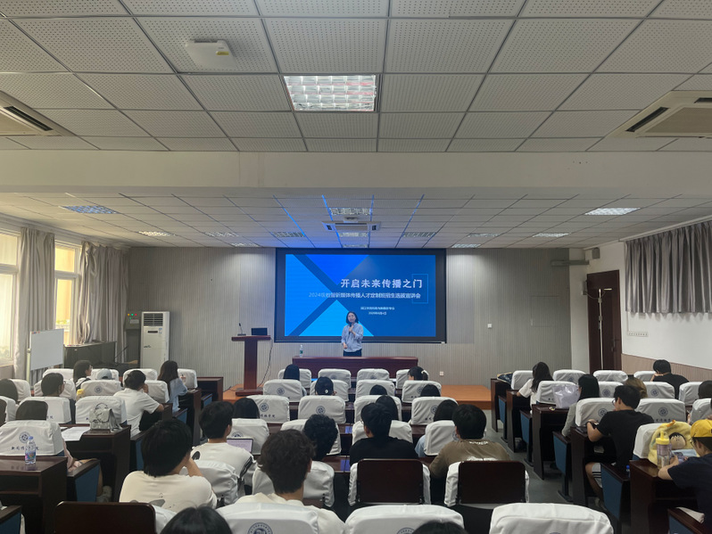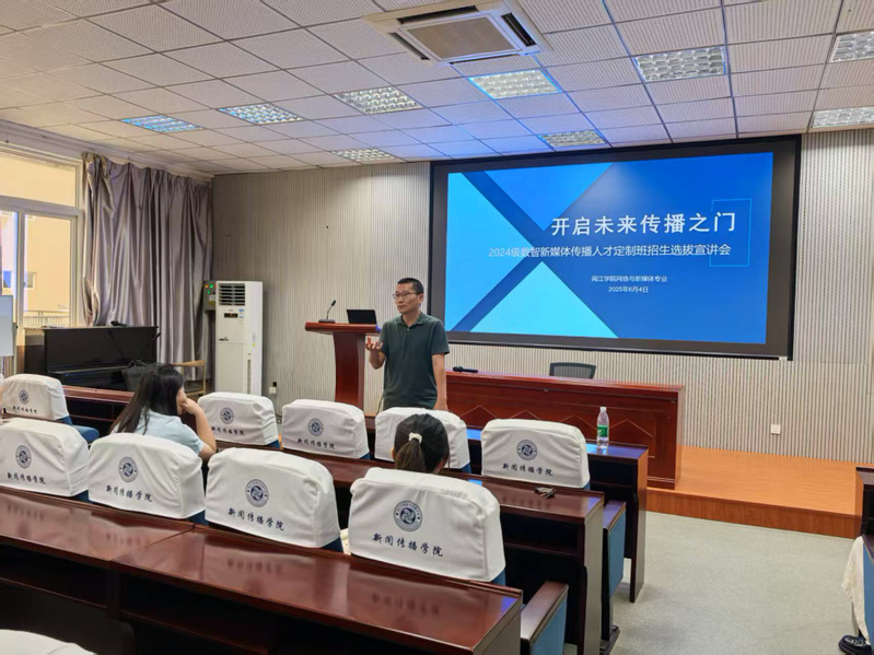 2025年6月4日下午,2024级数智新媒体传播人才定制班招生选拔宣讲会在 成人在线 学苑讲坛顺利召开。 成人在线 副院长戴程、网络与新媒体系主任李晓霞、教研室主任方圆、定制班班主任胡阳、专任教师叶立出席宣讲会。2024级网络与新媒体、广告学及学校其他各专业感兴趣的同学前来参会。