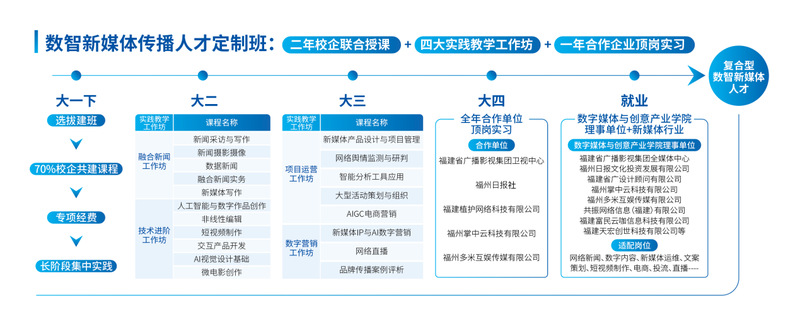 在具体办学特色及优势方面,定制班与福建省广播影视集团、福州日报社等主流媒体,植护、掌中云、多米互娱等多家网络科技公司建立了深度合作机制,依托融合新闻、技术进阶、项目运营、数字营销四大实践教学工作坊,为学生开设涵盖理论与行业认知、内容创作与生产、平台运营与管理、数字营销全流程的校企共建课程体系。
