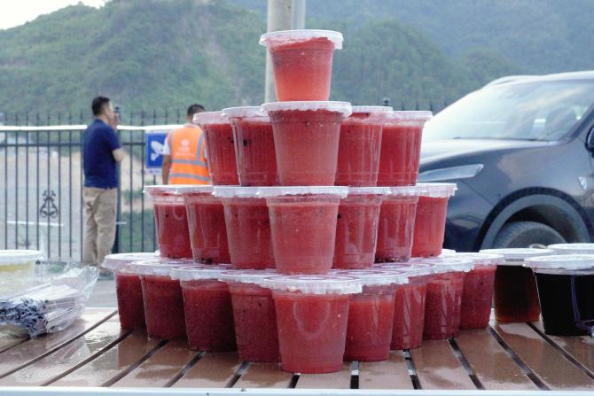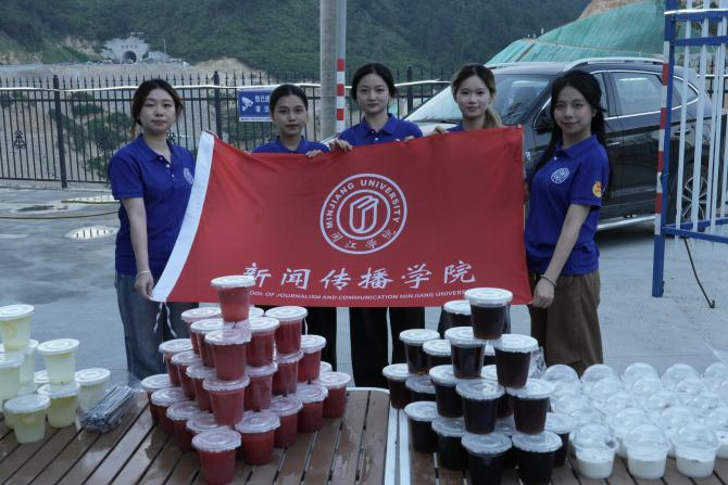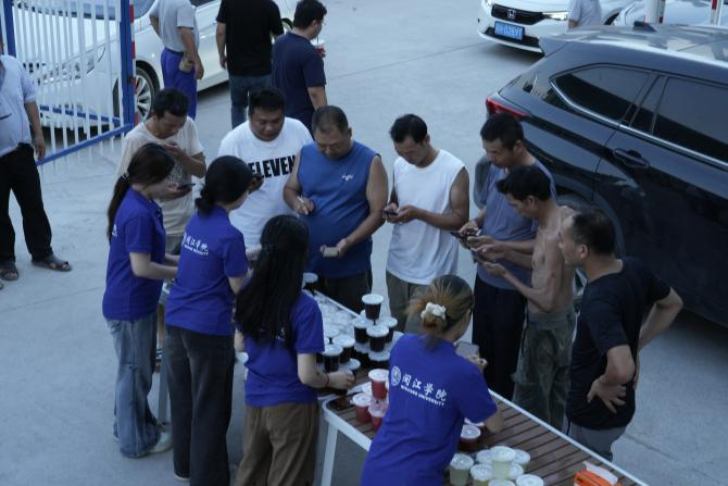 当天傍晚,正值工程建设者下班时段,实践队成员带着精心准备的100余杯解暑饮品、25份双皮奶及各类特色小吃,准时出现在工地休息区。西瓜汁甘甜清爽,柠檬水酸甜可口,酸梅汤醇厚解腻,还有金黄酥脆的薯条、鲜香多汁的烤丸等小吃,每一样都承载着他们的心意,希望能缓解建设者们一天的疲惫,为他们带来夏日里的丝丝凉意。