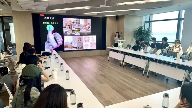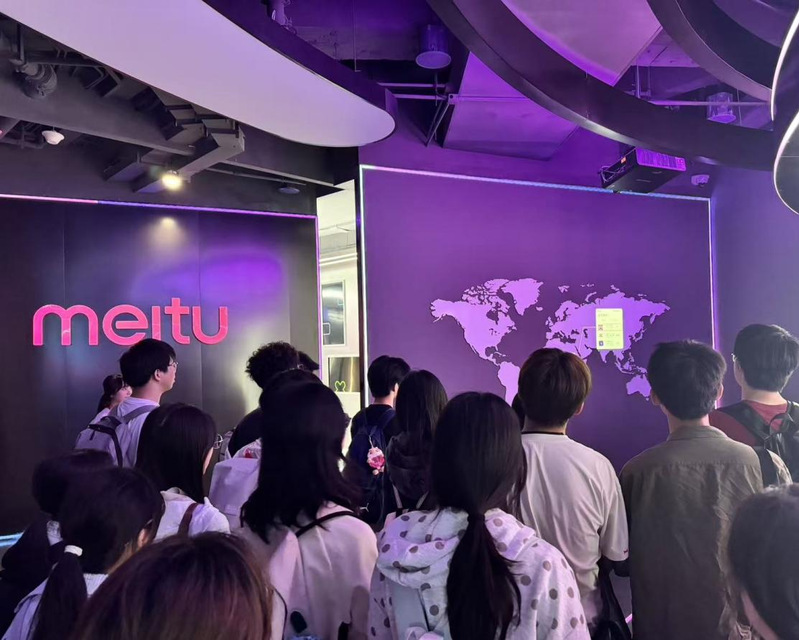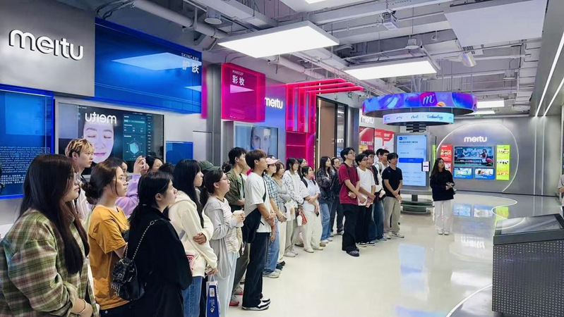 在美图公司专业讲解员的引导下,师生们首先参观了企业展厅,系统性地了解了美图公司的发展历程。历程回顾的第一阶段聚焦于“移动互联网的黄金十年(2008-2018)”。 从最初的美图秀秀桌面版,到顺应移动互联网浪潮推出的移动端应用,再到美颜相机、美拍等一系列现象级产品的矩阵化发展,师生们了解了美图如何以影像处理技术为核心,精准把握用户对“美”的追求,逐步构建起一个覆盖全球数亿用户的“美”的生态圈。历程回顾的第二阶段则进入了“人工智能浪潮中的美图(2019-至今)”。美图公司全面拥抱全球化,在生成式AI的助力下,美图多款产品荣登全球数十个国家应用商店总榜前10,推出了如Wink、美图设计室、美图云修、开拍、WHEE等一系列创新应用,且在今年发布影像Agent产品RoboNeo。师生们饶有兴致地亲身体验了多项前沿的AI影像功能,切身感受到了人工智能技术为艺术创作带来的无限可能与效率跃升。